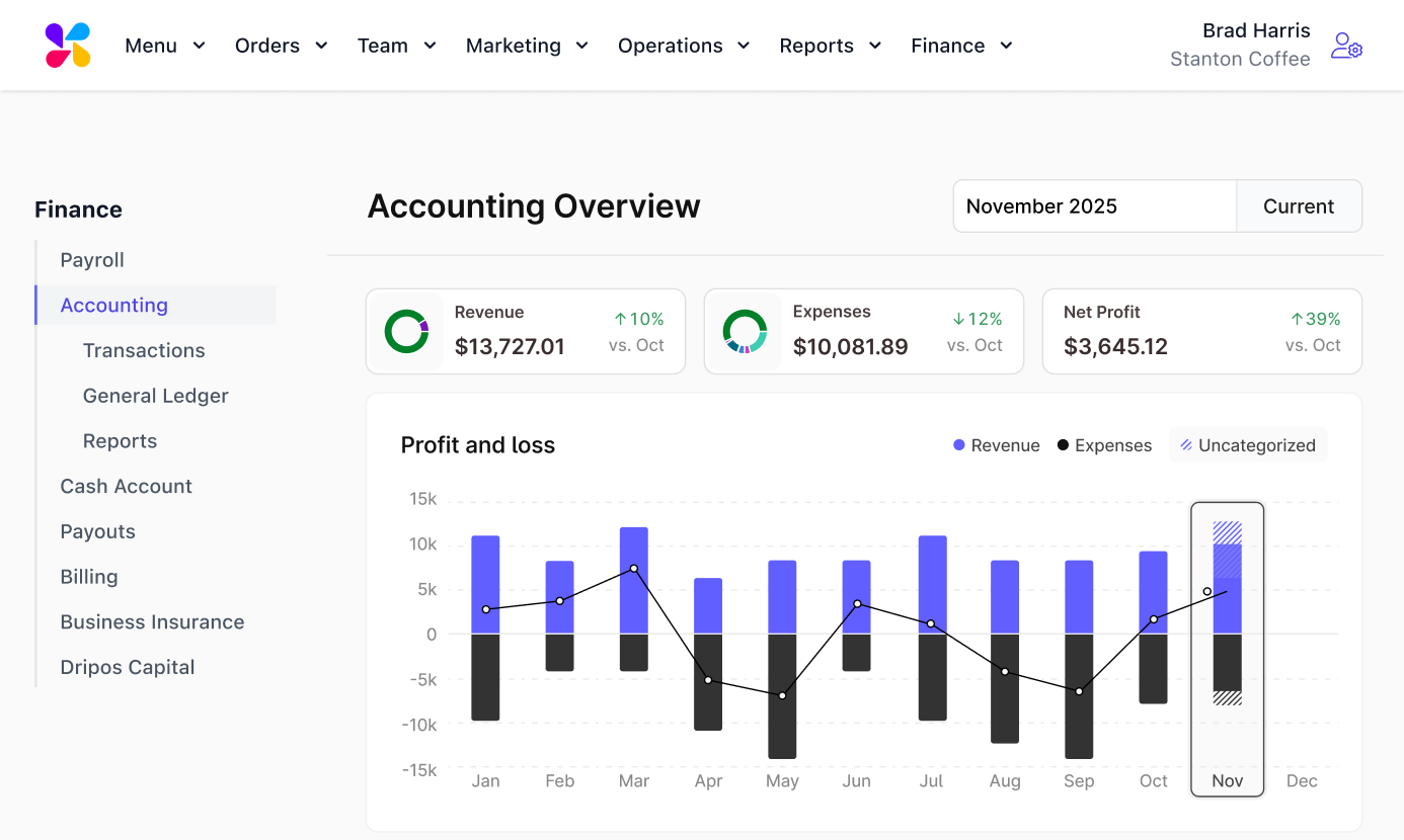 Dripos Accounting automatically captures all sales and labor data within Dripos and syncs expenses from business bank accounts and credit cards. Customers can easily categorize their business transactions and get complete financial reports right within the Dripos Dashboard.